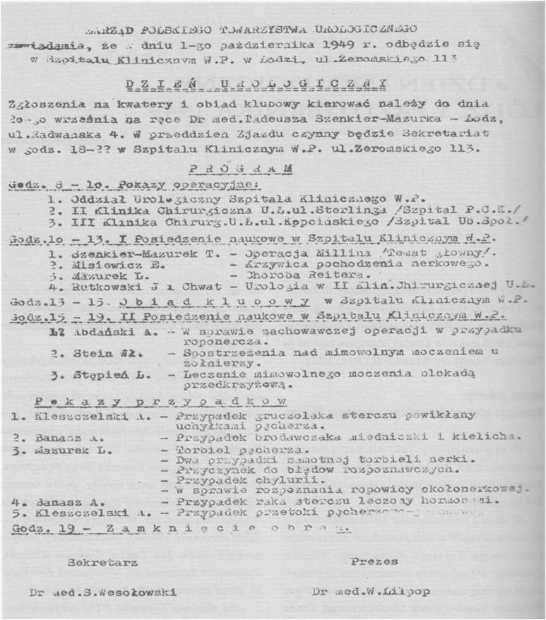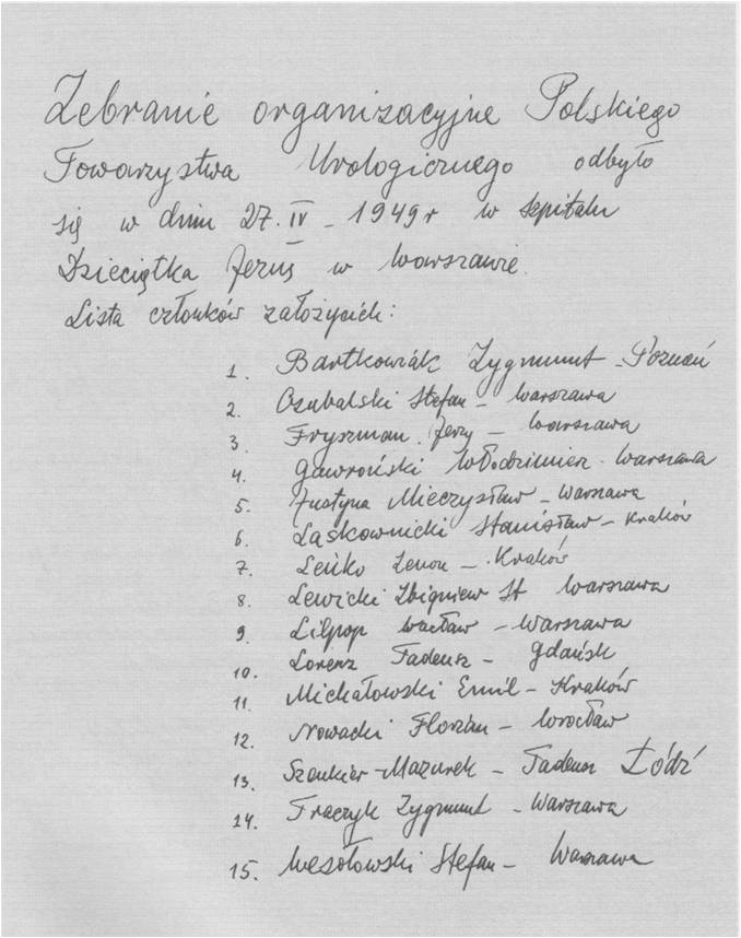 27.04.1949 roku. o godz. 11:00, w sali wykładowej II Kliniki Chorób Wewnętrznych AM prof. Witolda Orłowskiego, w Szpitalu Dzieciątka Jezus w Warszawie rozpoczęło się zebranie organizacyjne Polskiego Towarzystwa Urologicznego.
