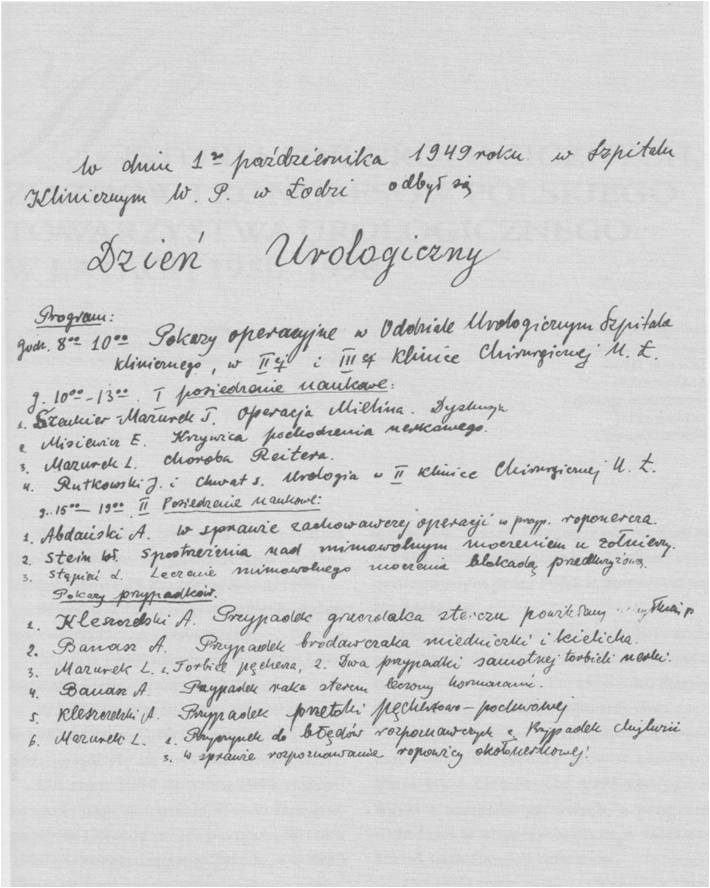 Spróbujmy wiec tutaj zestawić osiągnięcia urologii w latach powojennych. Pierwsza dodatnią pozycją będzie właśnie utworzenie Polskiego Towarzystwa Urologicznego i z tym związane nadzieje ożywienia ruchu naukowego w tej dziedzinie u nas przez organizowanie zjazdów i przede wszystkim założenie własnego organu, co dotychczas niestety, jest tylko pium desiderium. Jako dalsze pozycje dodatnie należy zanotować powstanie kilku oddziałów urologicznych np. we Wrocławiu i Gdańsku oraz odbudowę dawnych oddziałów, razem około dziesięciu.